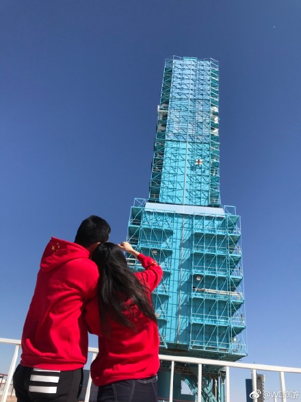10月3日上午,一对恋人在酒泉卫星发射中心的发射塔前拍照留念。@WE旅游/摄