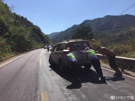 汽车抛锚停在路上,民警立即帮忙将车辆推至安全区域。假日期间,交警蜀黍助您安全行!@温州交警 供图